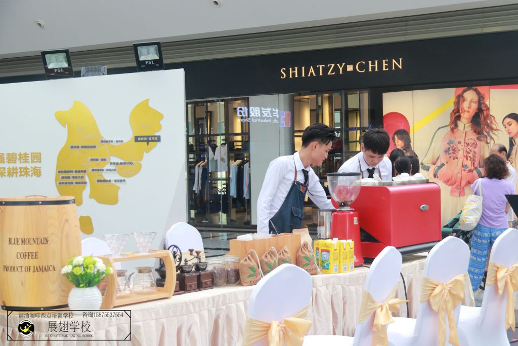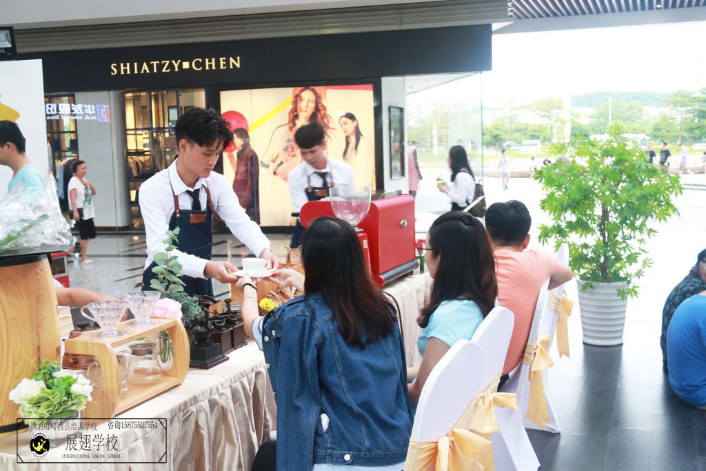 2018年8月11日,佛山展翅咖啡調酒西點培訓學校的咖啡師學員受邀在碧桂園濱海天際展覽廳為現(xiàn)場觀看與咨詢樓盤的嘉賓提供咖啡飲品。