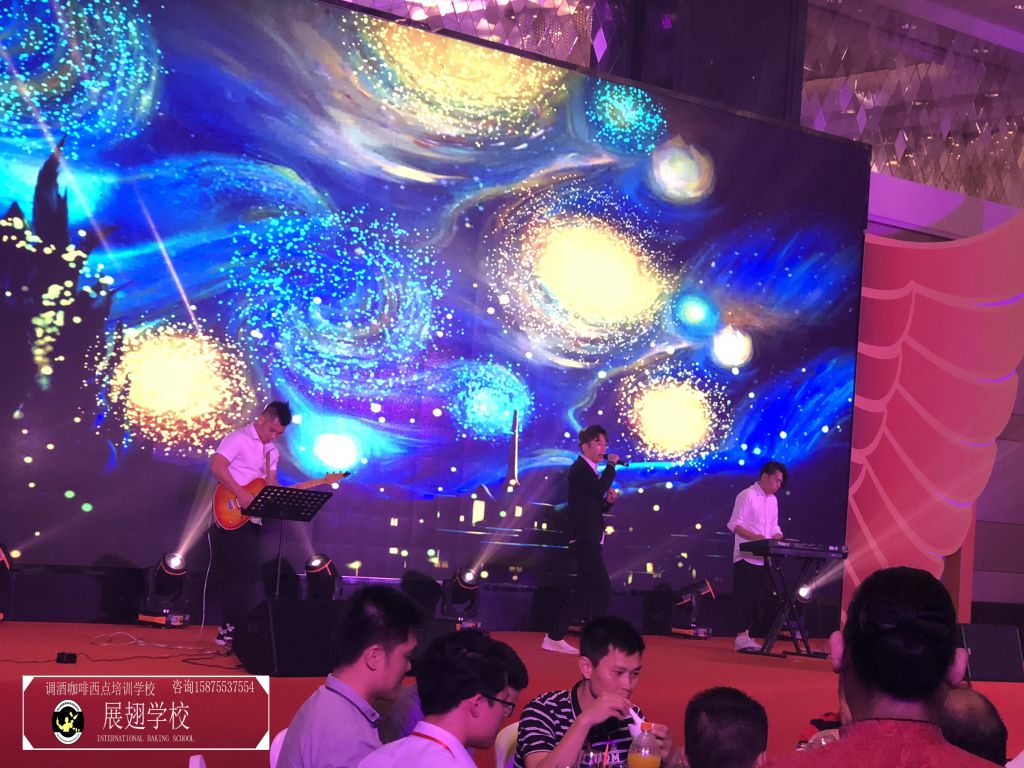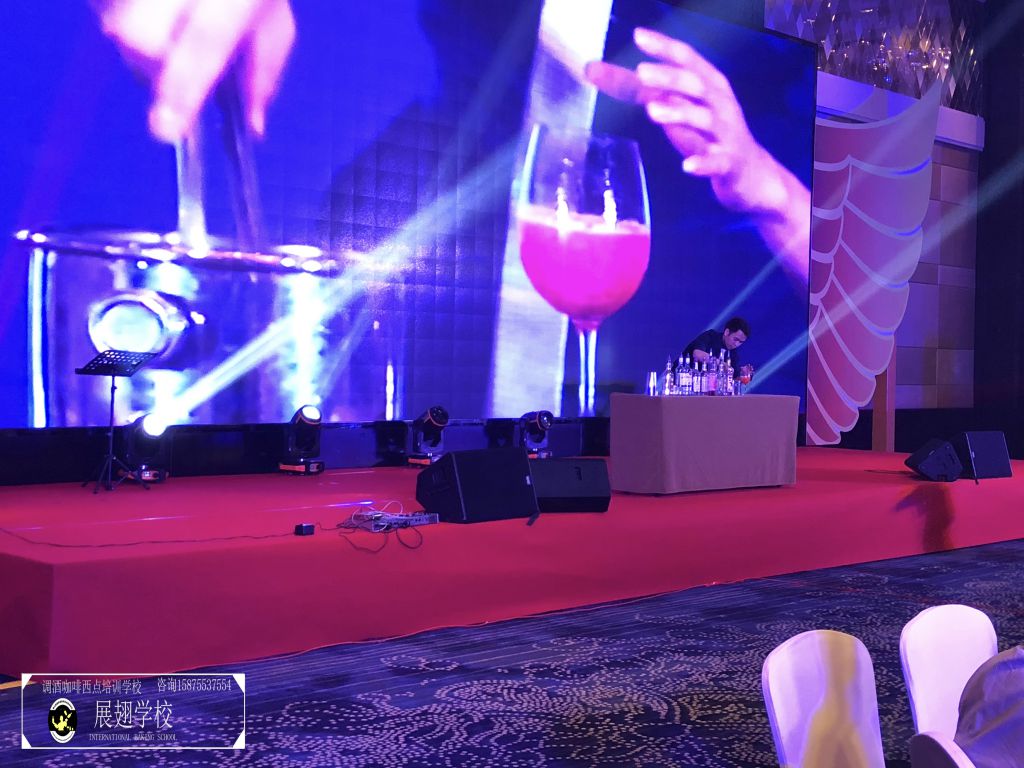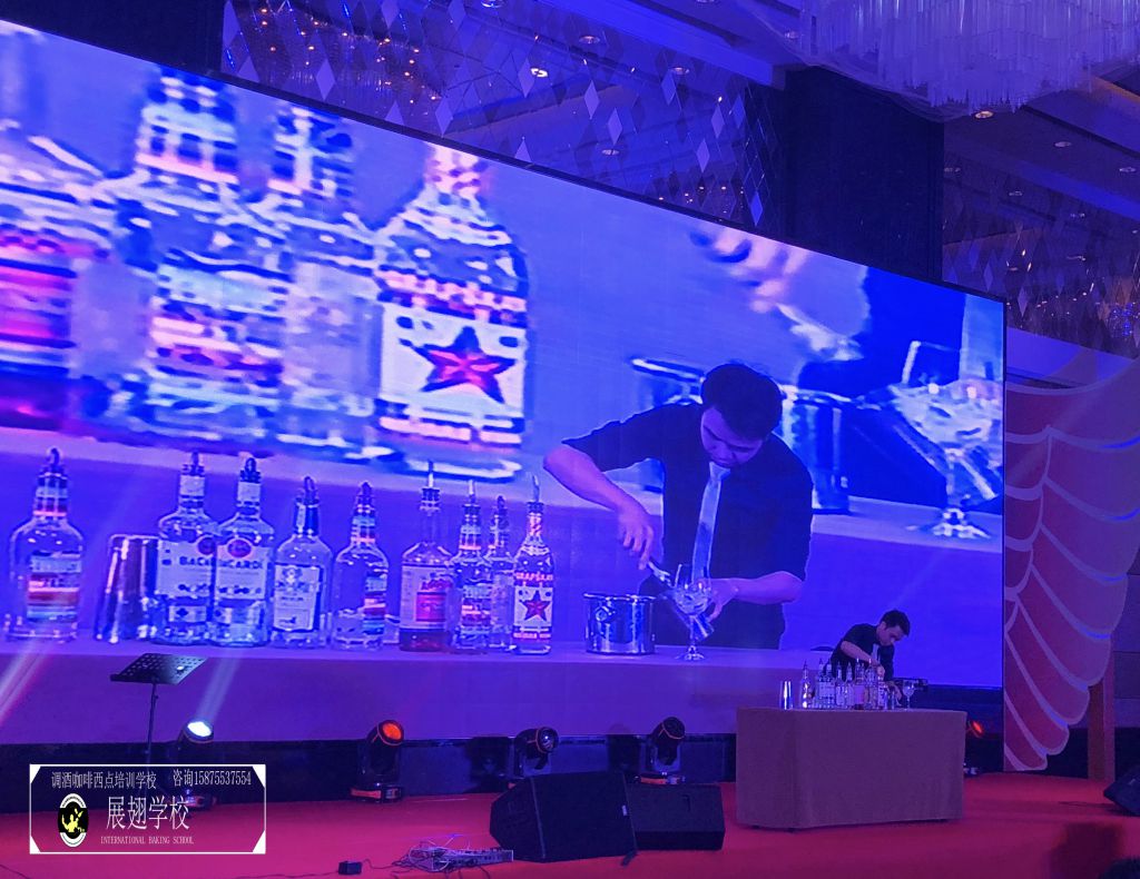 不多時(shí),全場(chǎng)佳肴已近杯盤(pán)狼藉,賓客們帶著點(diǎn)疲倦,會(huì)議氣氛一時(shí)走入低谷。瞬間,滾動(dòng)性極強(qiáng)的音樂(lè)使得全場(chǎng)目光都投注到大屏幕上,佛山展翅咖啡調(diào)酒西點(diǎn)培訓(xùn)學(xué)校的花式調(diào)酒師張韋杰先生已經(jīng)登場(chǎng)。張韋杰先生前面的桌上擺放著七八瓶不同款式的酒,少許調(diào)酒工具,和一只雞尾酒酒杯。全場(chǎng)帶著好奇的目光盯著臺(tái)上:能調(diào)出什么顏色的酒?