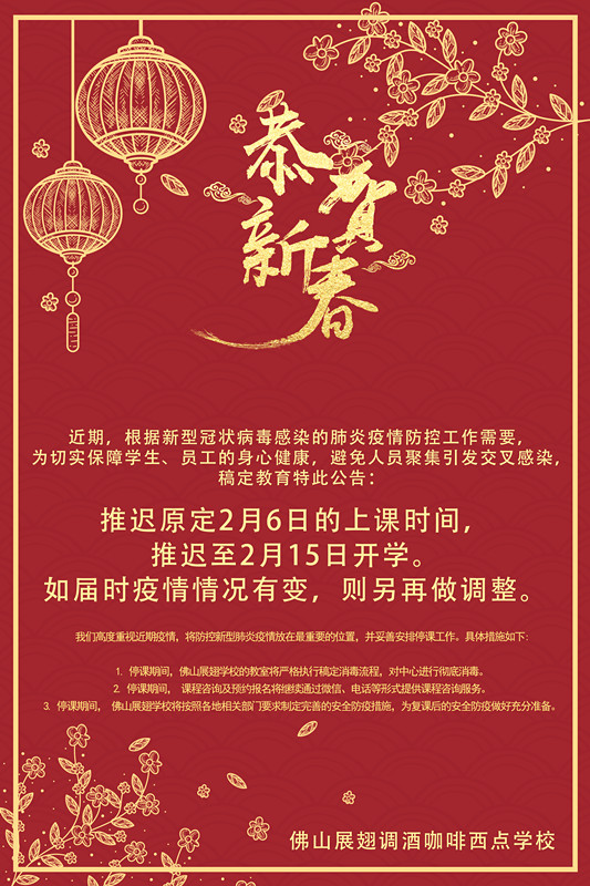 為避免春運返程引起大面積傳播、感染,各大技術(shù)院校紛紛推遲開學、開工。佛山展翅學院作為其中的一員,積極響應國家號召,切實保障學院每位學生與工作人員的身體安全,決定將開學時間延遲至2020年2月15日(年廿二)。