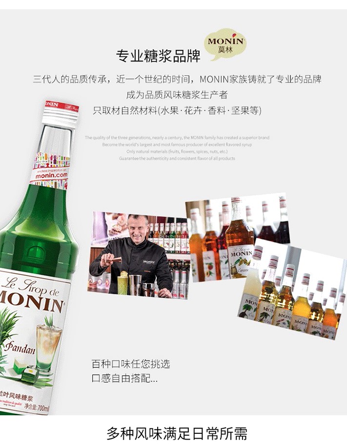 1912 年,Georges MONIN在法國創(chuàng)立了以家族名字命名的品牌與第一家工廠,專注生產(chǎn)優(yōu)質利口酒與糖漿。因他對待品質的熱誠與執(zhí)著讓產(chǎn)品脫穎而出,讓MONIN成為優(yōu)質產(chǎn)品的代名詞,現(xiàn)已是世界上著名的風味糖漿生產(chǎn)者。近年來,MONIN堅持不斷創(chuàng)新,嚴打新風味與應用方式,致力于傳遞完美餐飲體驗,引領飲品多元化發(fā)展,為餐飲企業(yè)提供完美解決方案!