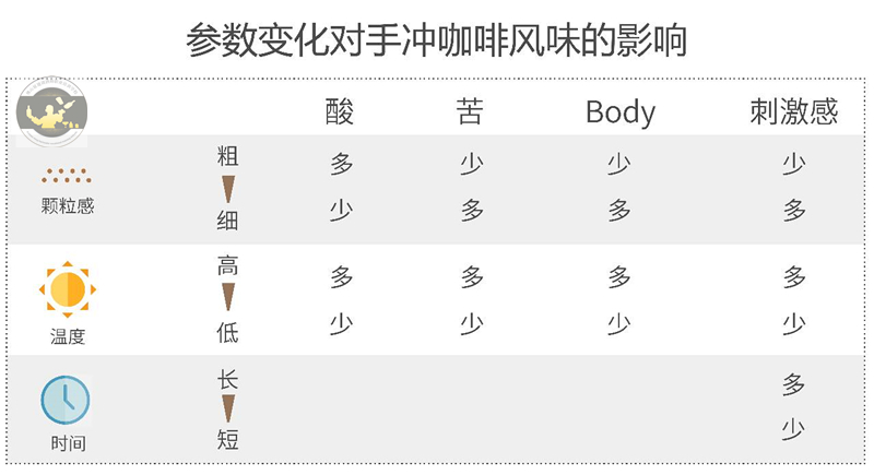 那么讓我們來(lái)看看各參數(shù)的變化如何影響一杯手沖咖啡的風(fēng)味吧: